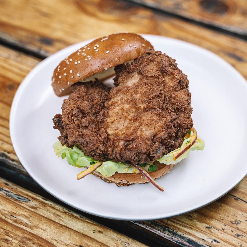 fried thigh, red onion, serrano, cabbage, watermelon radish slaw, pickles, lemon vinaigrette, chipotle aioli, slipper roll | Bacon $4.00